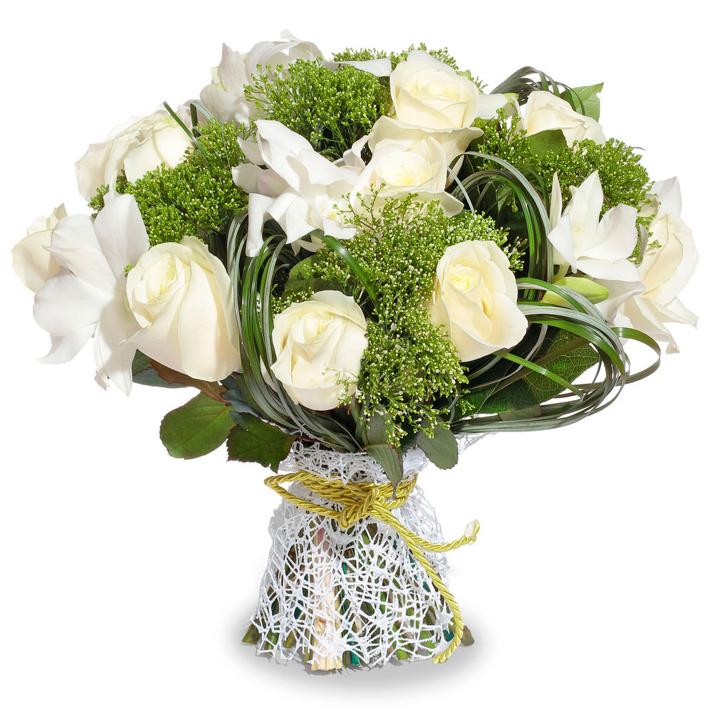 Роза одноголовая белая, берграс, салал, трахелиум, фрезия белая. Упаковка (лента, пленка, крафт, сетка, пленка матовая)