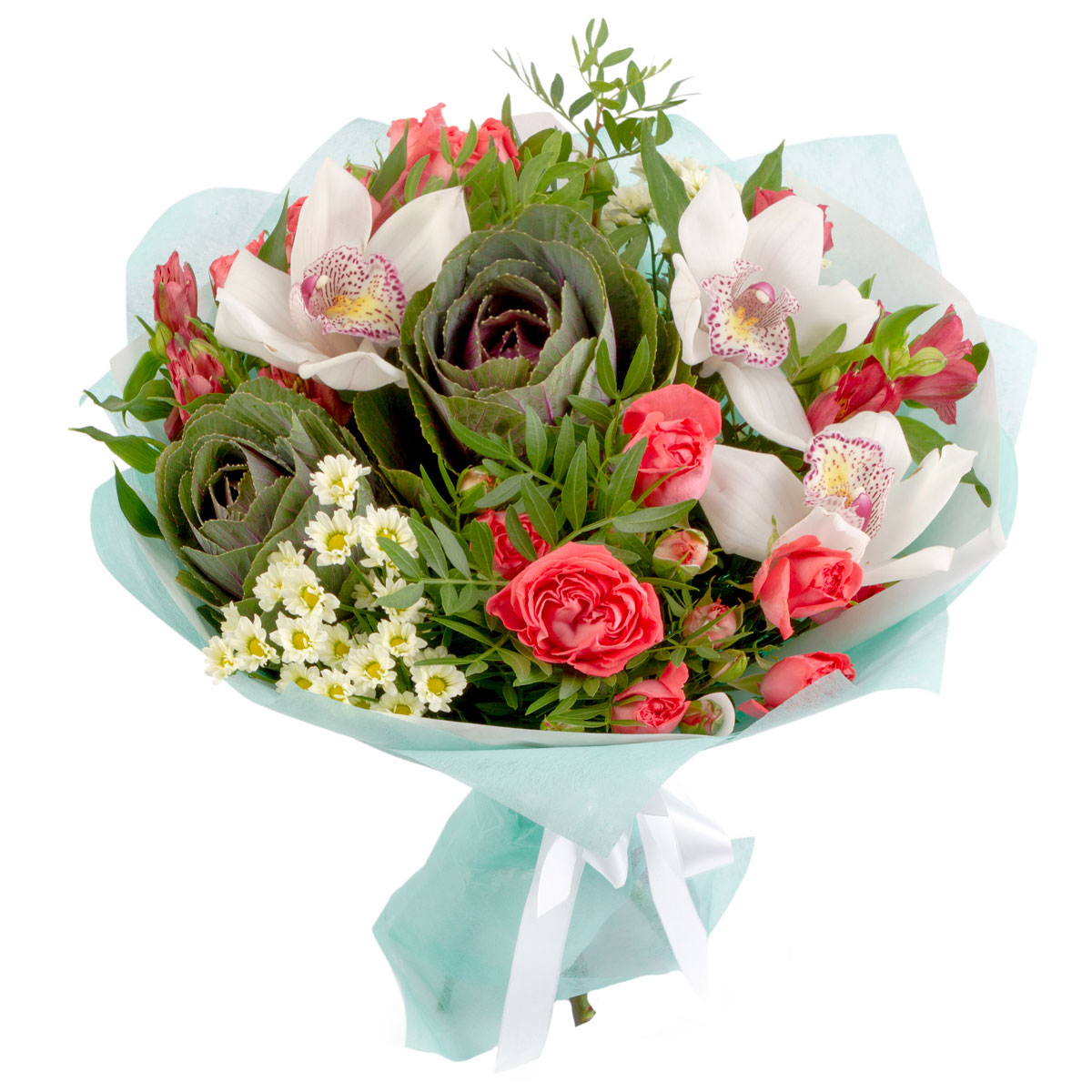 Орхидея белая, роза кустовая розовая, альстромерия розовая, брассика, ромашка, фисташка. Упаковка (лента, пленка, крафт, сетка, пленка матовая)