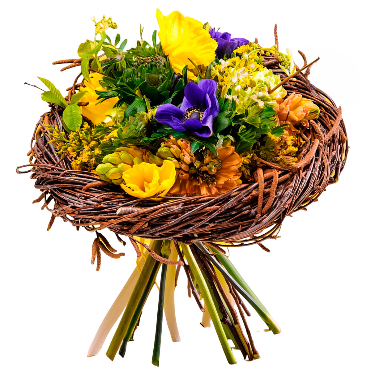 Нарцисс желтый, гиацинт желтый и оранжевый, анемон синий, солидаго. В каркасе