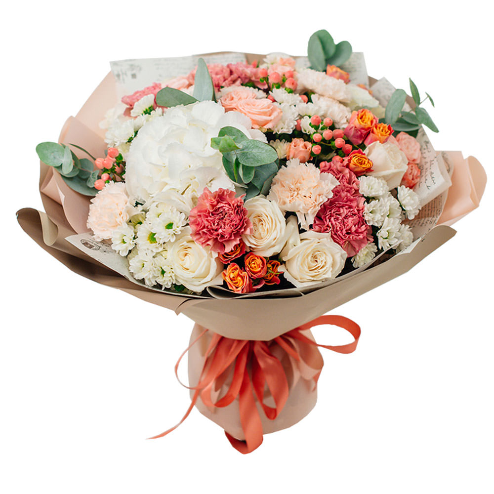 Гортензия белая, гвоздика микс (кремовая, розовая), роза кустовая розовая, хризантема кустовая белая, роза одноголовая белая, гиперикум, эвкалипт. Упаковка (лента, пленка, крафт, сетка, пленка матовая)