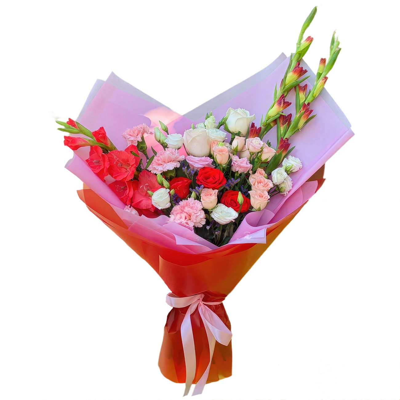 Гладиолус красный, роза одноголовая белая, роза кустовая розовая и красная, гвоздика розовая, эустома белая, статица. Упаковка (лента, пленка, крафт, сетка, пленка матовая)