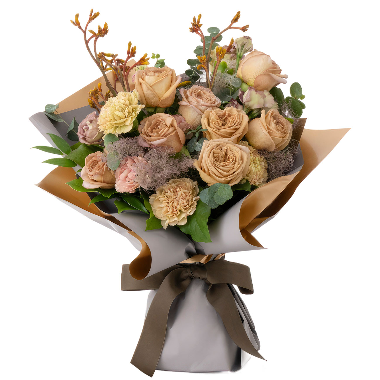 Роза капучино кенийская, гвоздика шампань, японский куст, эвкалипт. Упаковка (лента, пленка, крафт, сетка, пленка матовая)