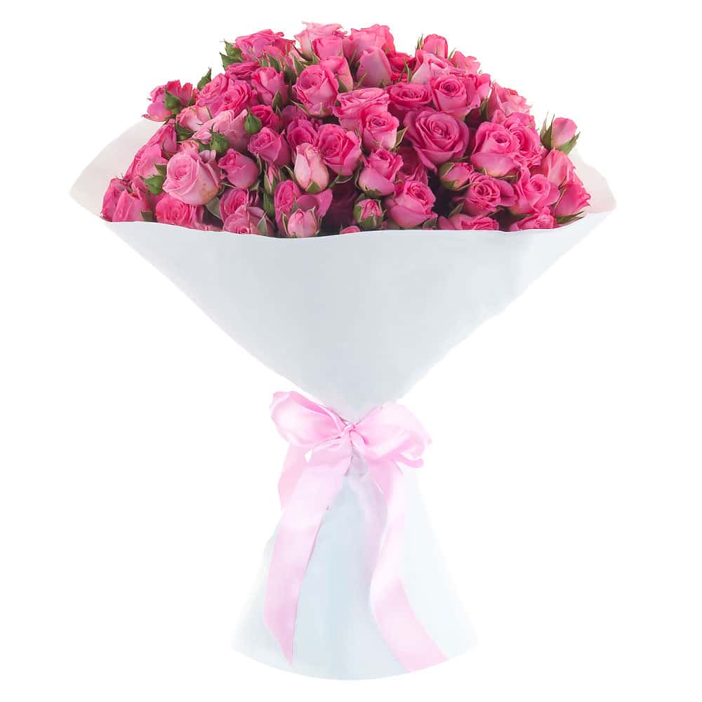Роза кустовая розовая. Упаковка (лента, пленка, крафт, сетка, пленка матовая)