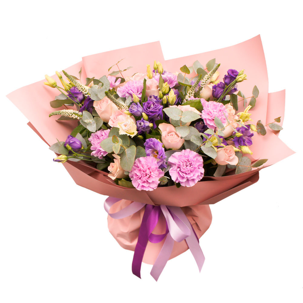 Гвоздика сиреневая, эустома белая, роза одноголовая розовая, вероника, эвкалипт. Упаковка (лента, пленка, крафт, сетка, пленка матовая)