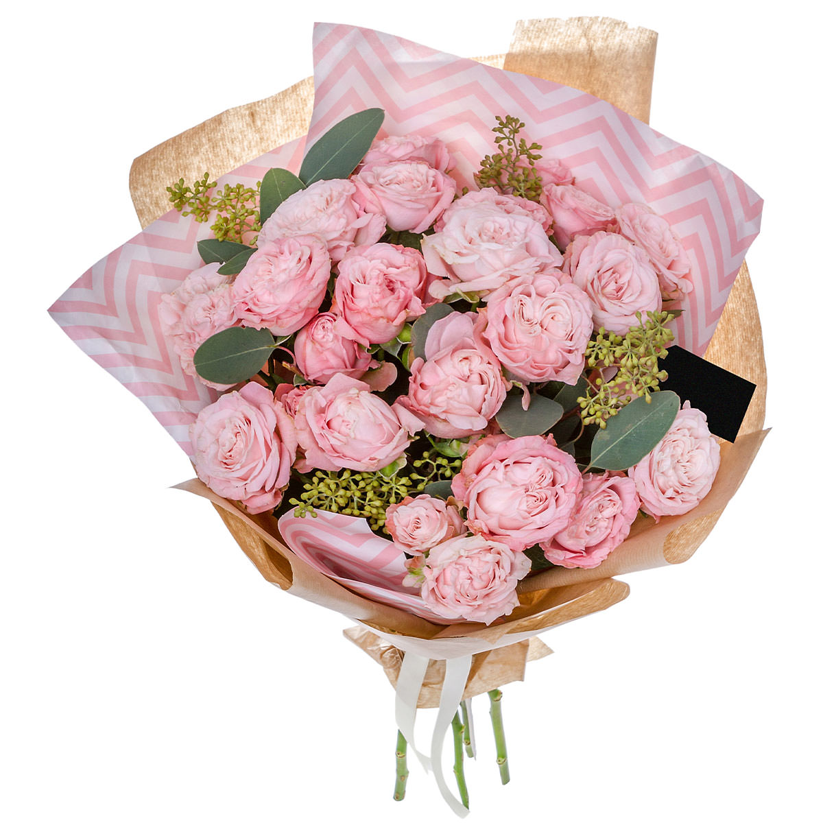 Роза кустовая розовая, эвкалипт, зелень. Упаковка (лента, пленка, крафт, сетка, пленка матовая)