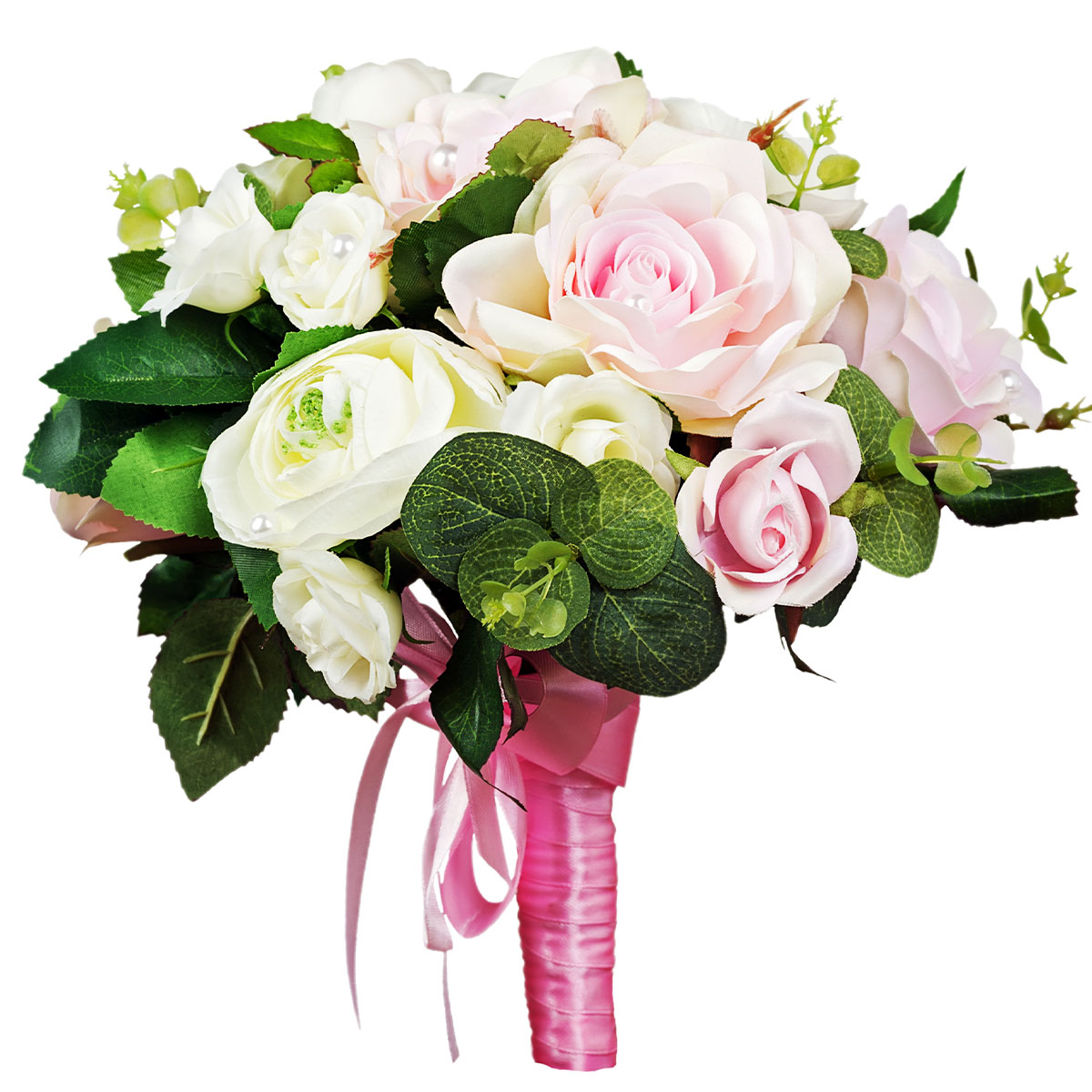 Роза одноголовая розовая и белая, декоративные бусинки, зелень. Упаковка (лента, пленка, крафт, сетка, пленка матовая)