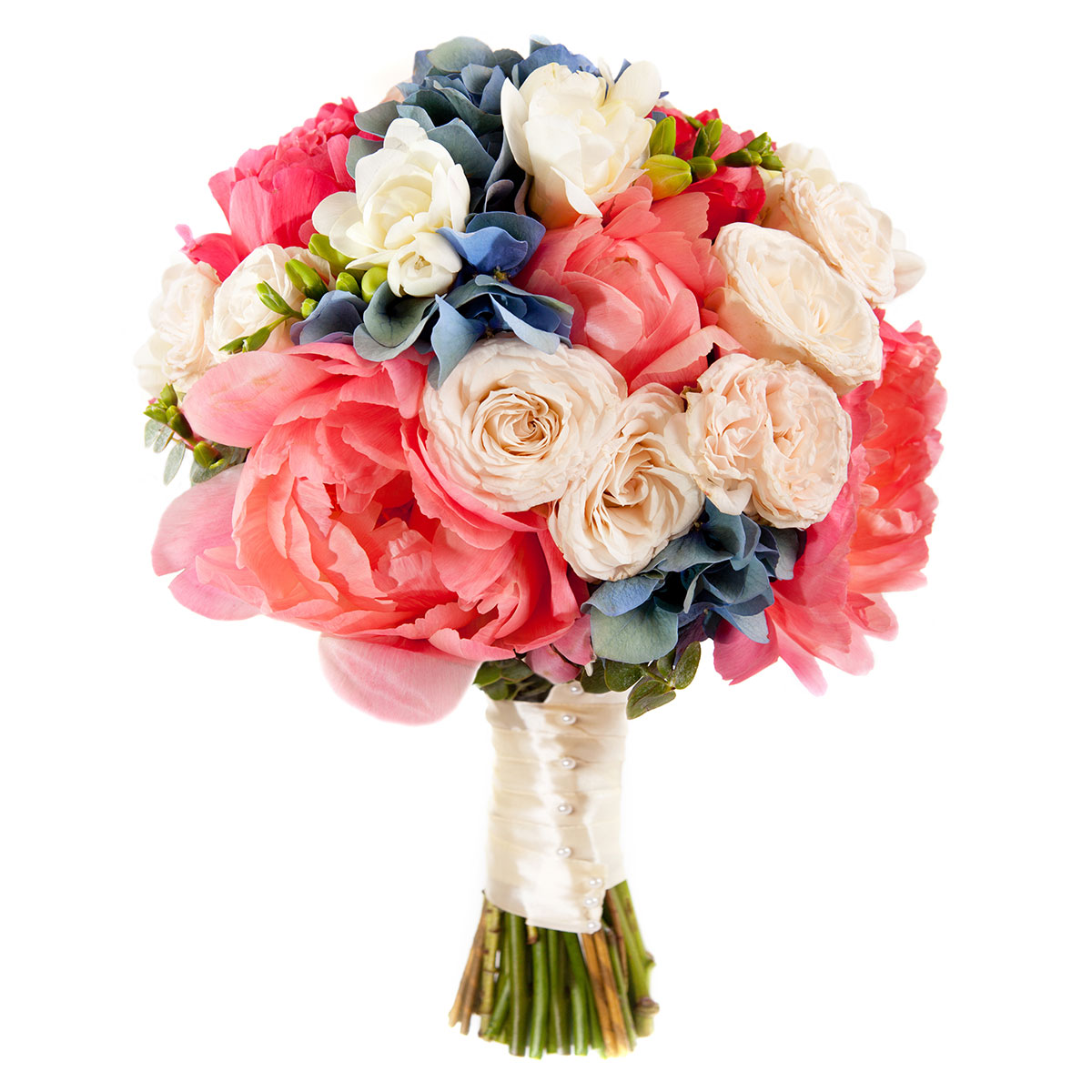 Пион коралловый, фрезия белая, гортензия синяя, роза пионовидная кремовая, эвкалипт. Упаковка (лента, пленка, крафт, сетка, пленка матовая)