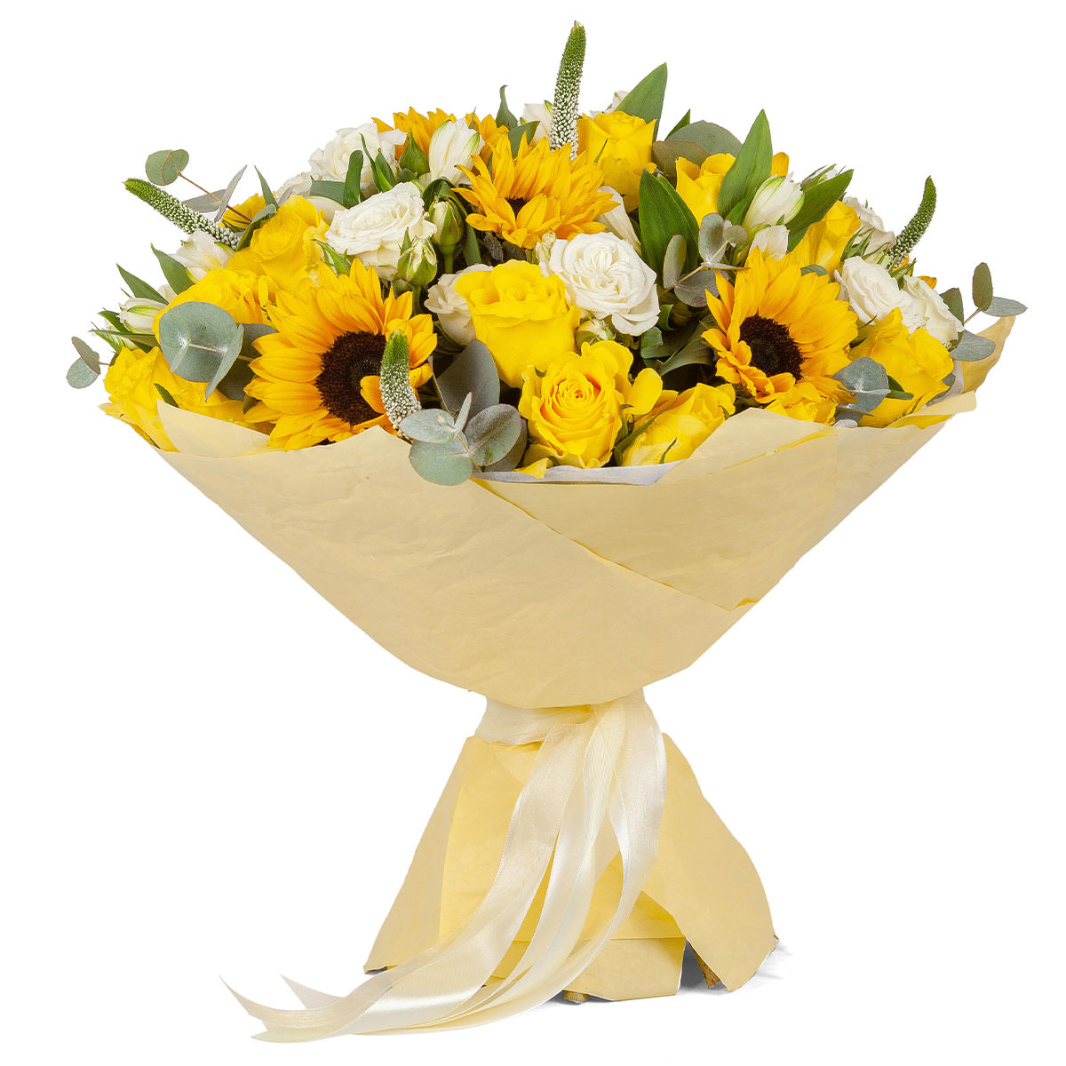 Подсолнух, роза кустовая желтая и белая, вероника, эвкалипт. Упаковка (лента, пленка, крафт, сетка, пленка матовая)