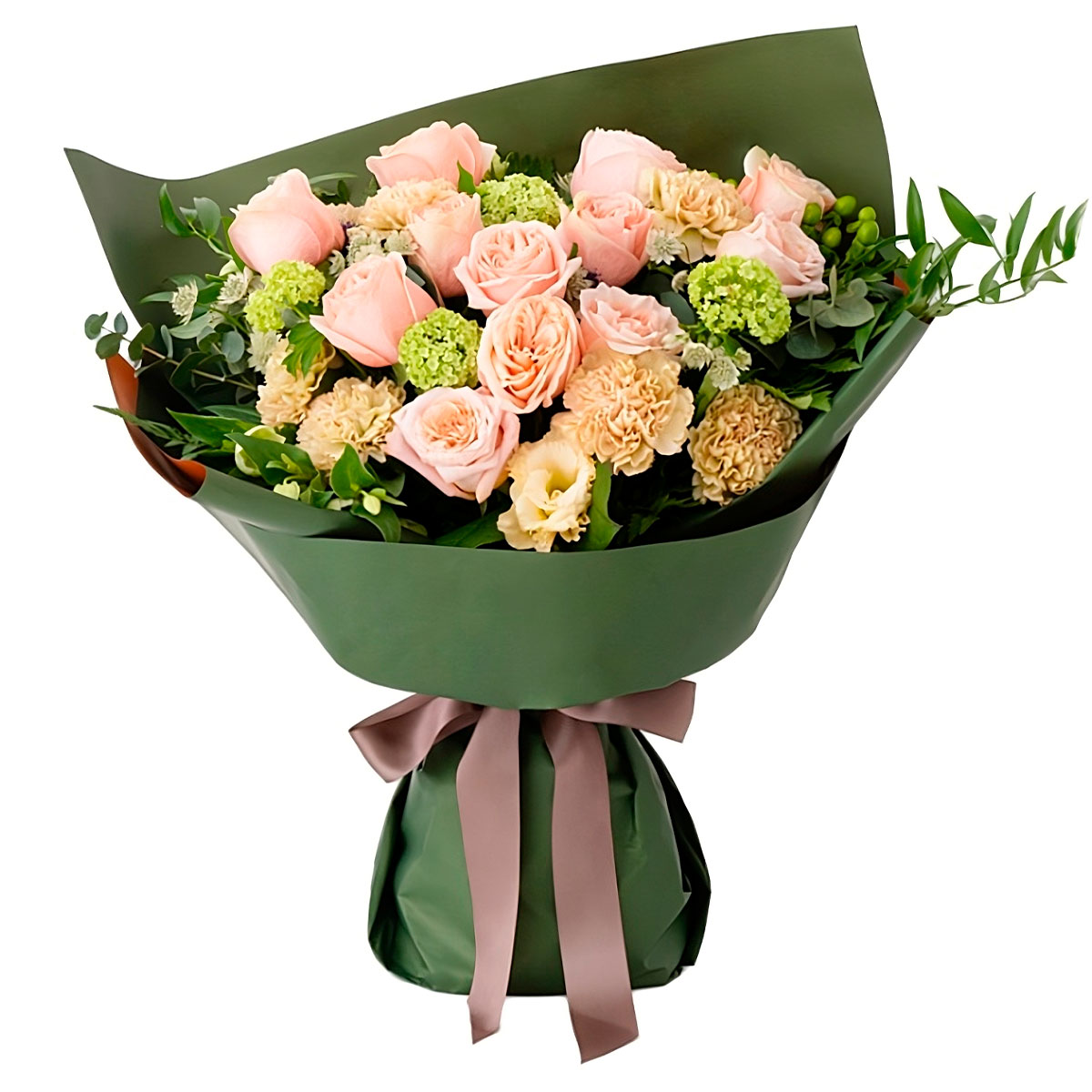 Роза пионовидная розовая, эустома кремовая, гиперикум, салал, эвкалипт, гвоздика. Упаковка (лента, пленка, крафт, сетка, пленка матовая)