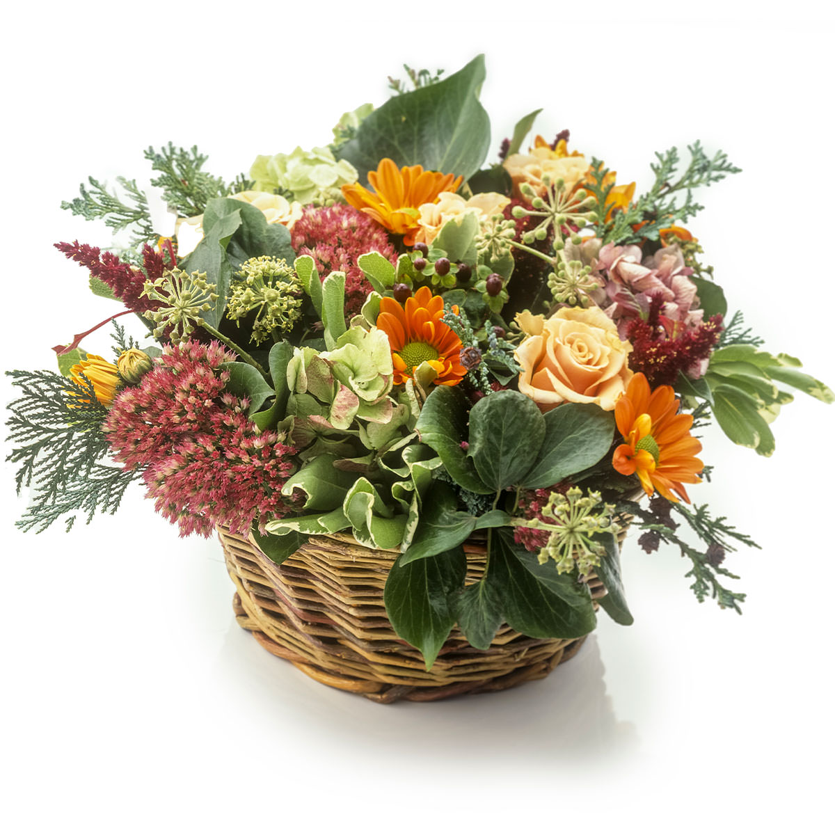 Роза одноголовая желтая, хризантема кустовая оранжевая, очиток, туя, зелень. Упаковка (Корзина, оазис, ящик).