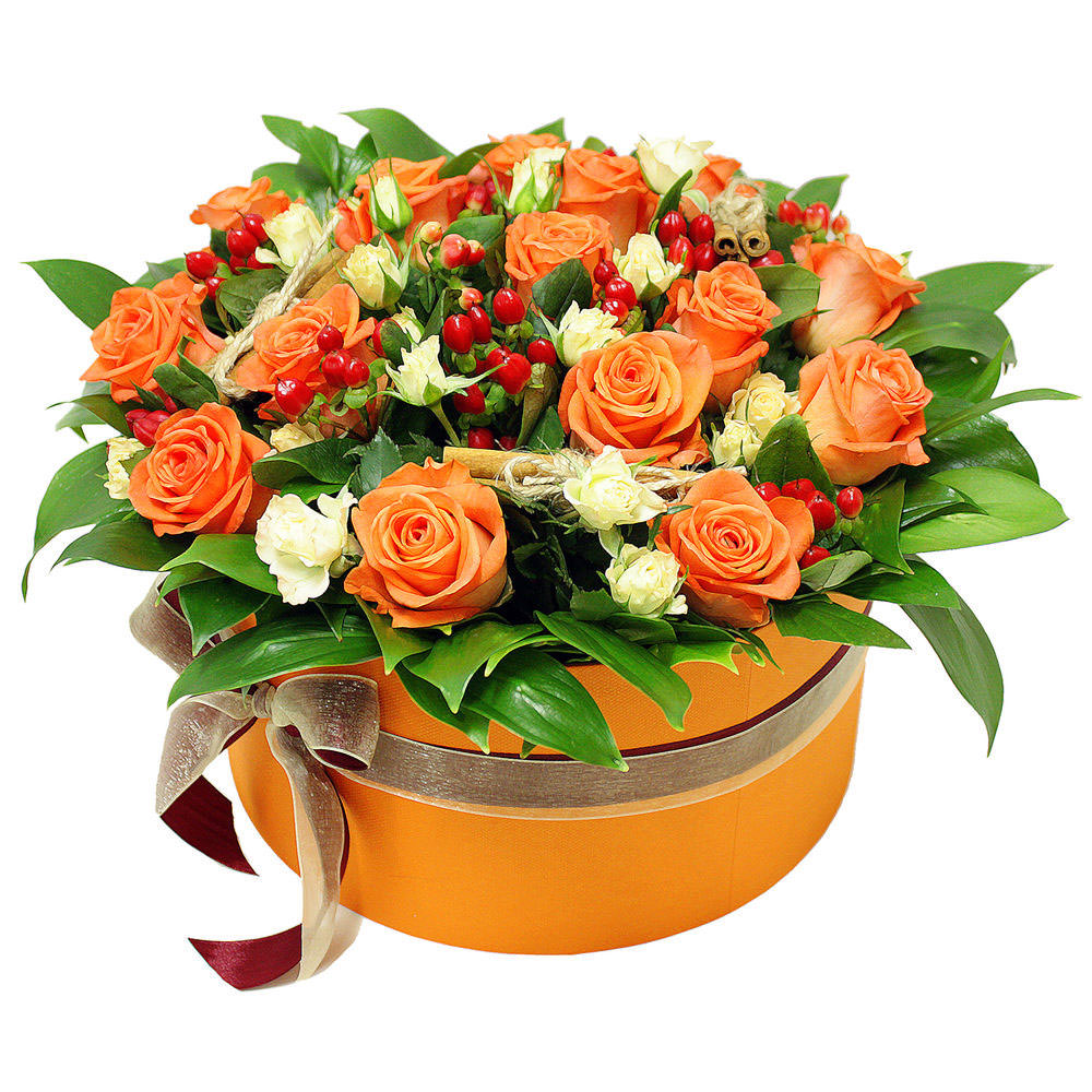 Роза одноголовая оранжевая, роза кустовая белая, гиперикум, аспидистра. Упаковка (шляпная коробка, квадратный бокс, коробка сердце, оазис)