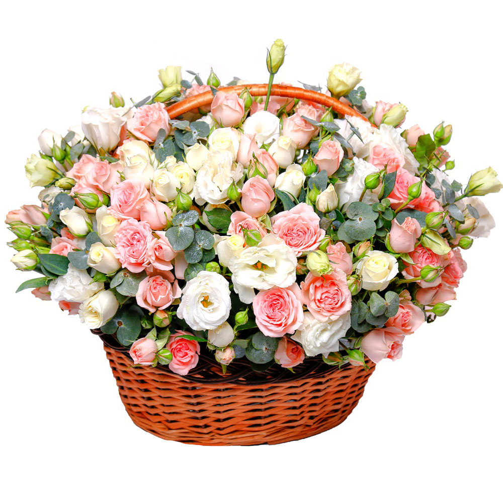 Роза кустовая розовая, эустома белая, эвкалипт. Упаковка (Корзина, оазис).